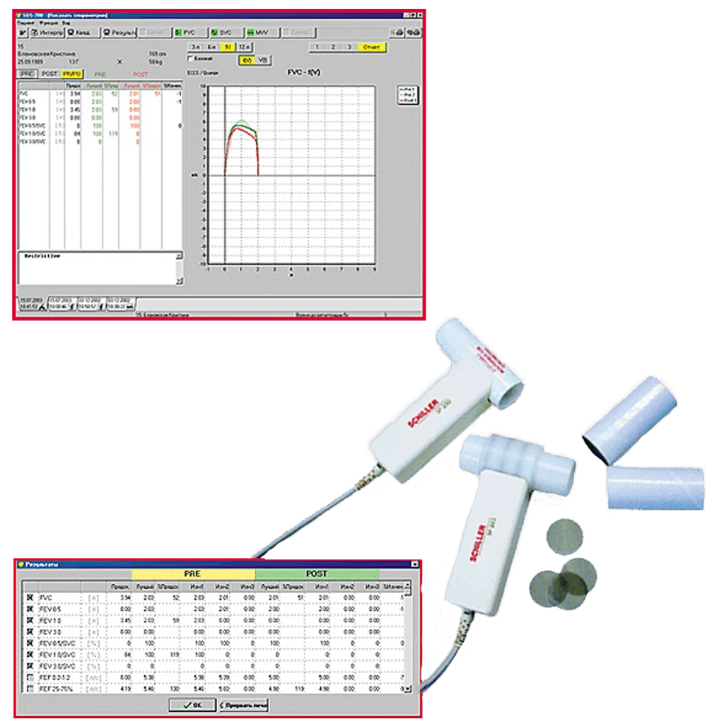 Измерения: -пре- и пост-медикаментозные тесты -тесты на вдохе и выдохе -кривые FVC; SVC; MV; MVV -автоматическая классификация -отвечает стандартам ATS -должные значения ECCS/Quantier; американский стандарт и т.д.