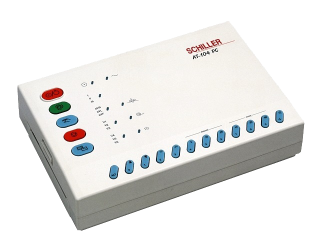 Электрокардиограф Schiller CARDIOVIT AT-104 PC уникальный прибор, электрокардиограф и компьютерная станция в одном диагностическом комплексе, в автономном режиме работающая как 3-х канальный электрокардиограф, а при подключении к компьютеру — в режиме усилителя ЭКГ.