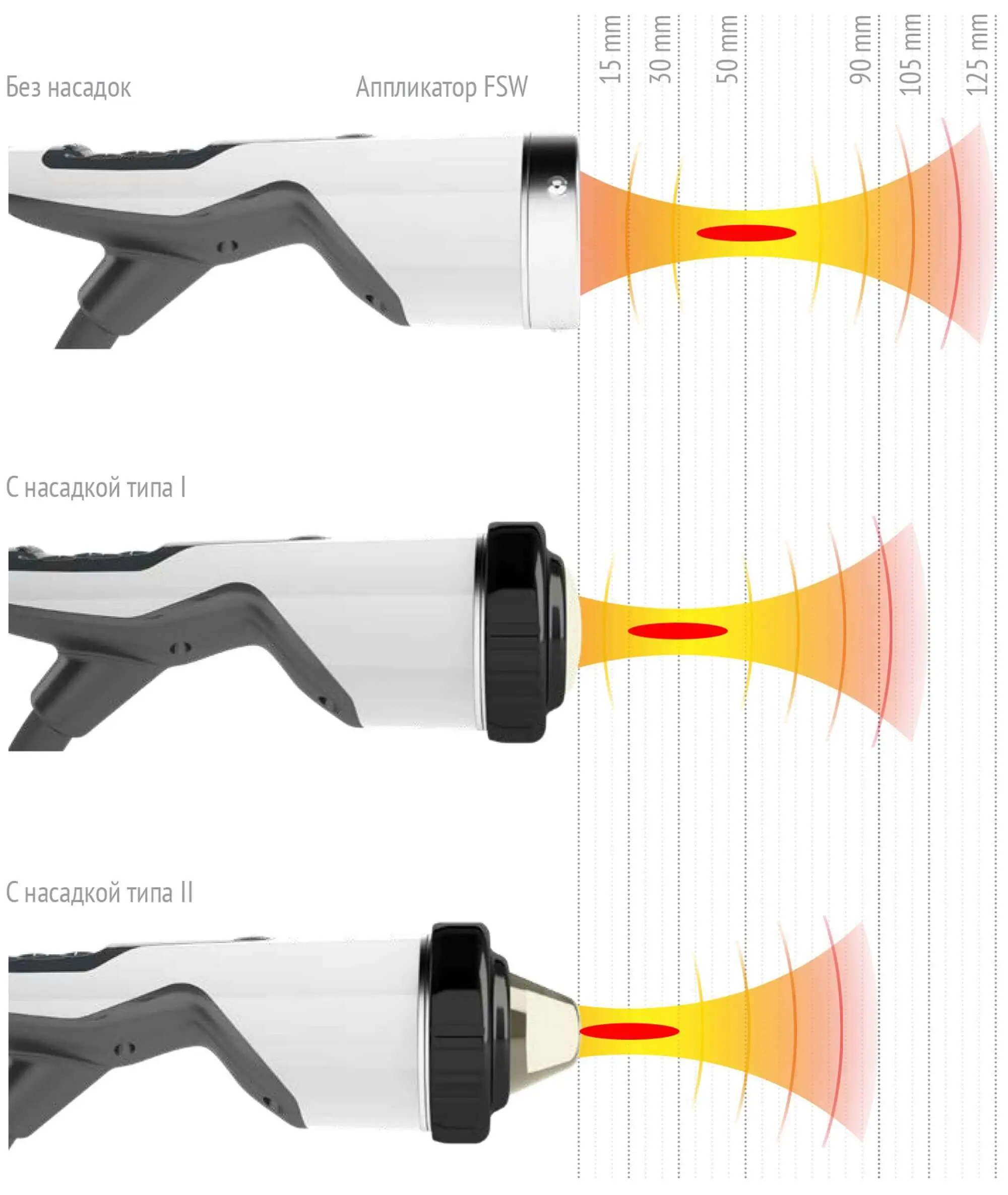 - возможность выбора насадок различного диаметра и набора аппликаторов для точного воздействия на разные зоны тела;